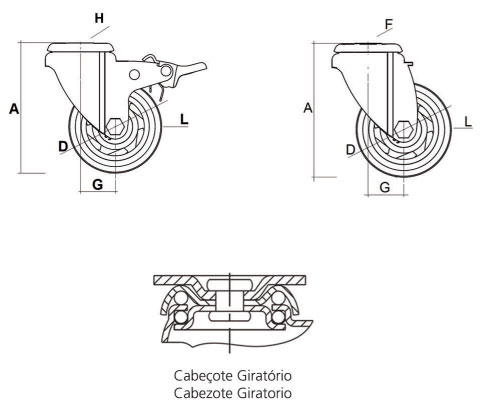 Garfo estampado em chapa de aço com acabamento zincado. Cabeçote giratório com 2 pistas de esferas. Freio total (roda e giro).